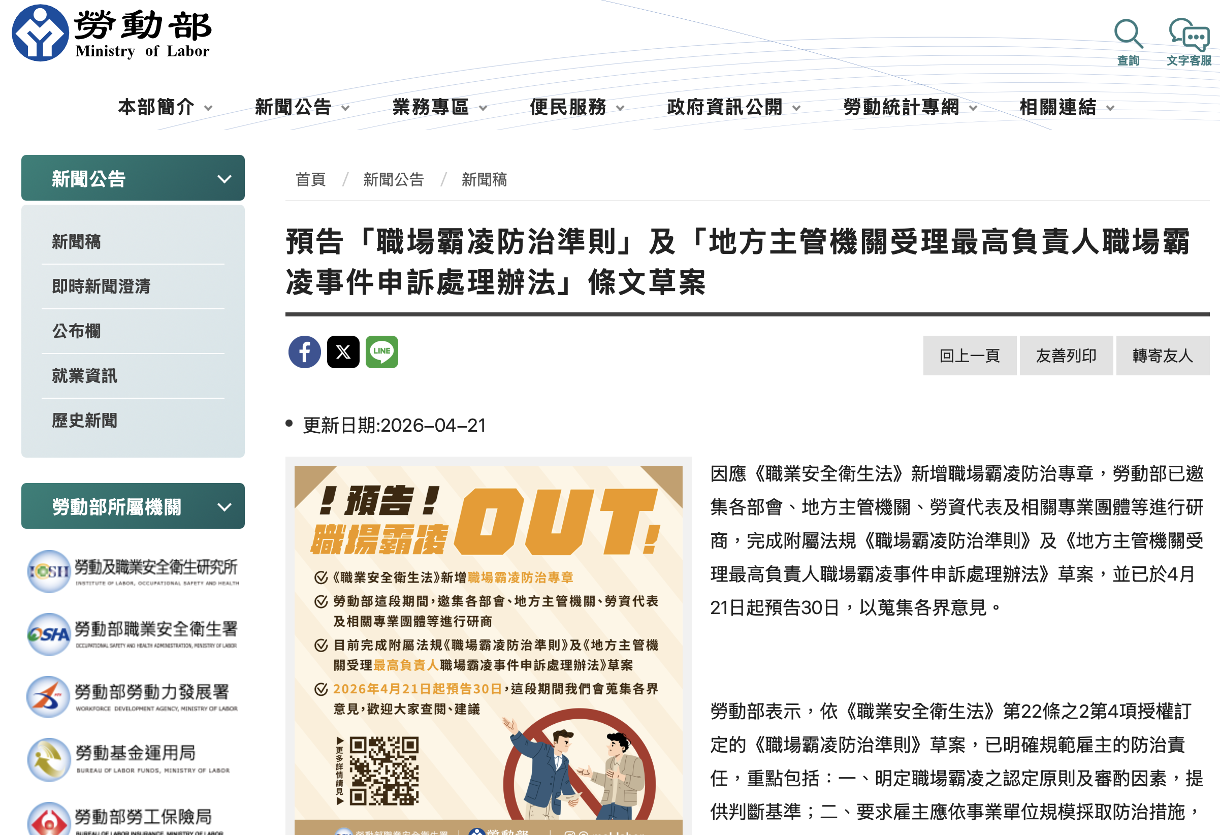 勞動部於2026年4月21日預告《職場霸凌防治準則》及相關申訴處理辦法草案,後續將正式建立企業防治職場霸凌之制度架構。