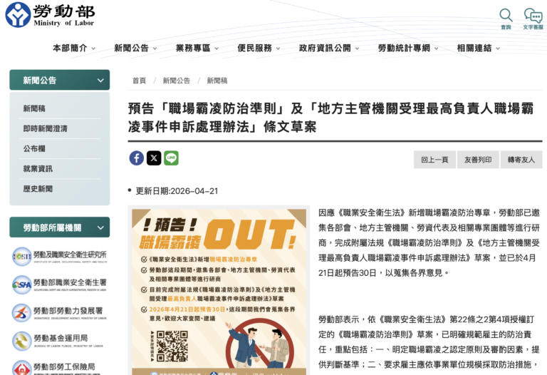 勞動部於2026年4月21日預告《職場霸凌防治準則》及相關申訴處理辦法草案,後續將正式建立企業防治職 …